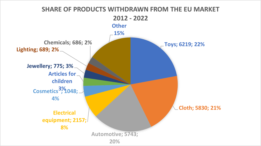 Also, products that may be considered safe in principle may carry a risk for the user. E.g. clothing, which accounts for as much as 21% of the recalls in the EU. This is quite surprising, if only because of the lack of complexity of this type of product. The main causes of risk here are usually chemicals that can penetrate the skin and clothing parts that pose a risk to children (e.g. loose parts such as cords or buttons that pose a choking/suffocation risk).